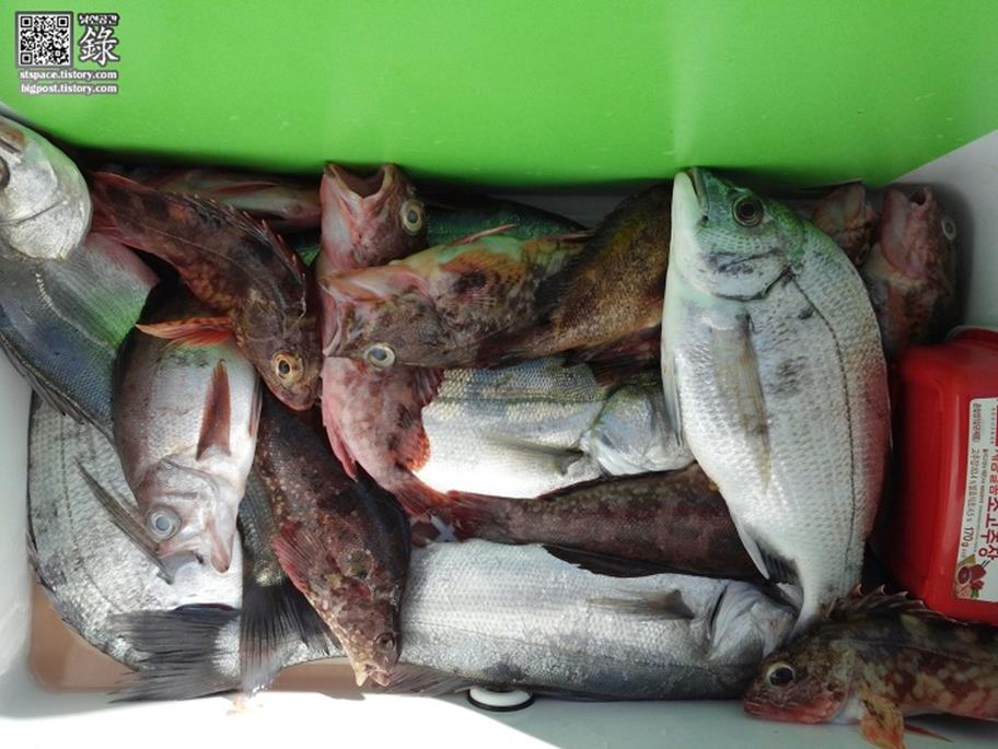 1박 3일의 야영 동안 감생이 2마리, 볼락 수십 마리, 노래미 10여 수, 용치 10여 수, 졸복 서너 마리, 이름 모를 바라쿠다 치어 같은 물고기 2마리, 붕장어 2마리, 깔따구(농어 새끼) 4마리 등을 낚아냈습니다. 첫날의 조과는 썰물 때 살림망이 갯바위에 올라탔는지 게들의 밥이 되고 말았지만, 낚시의 즐거움을 만끽할 수 있었습니다.