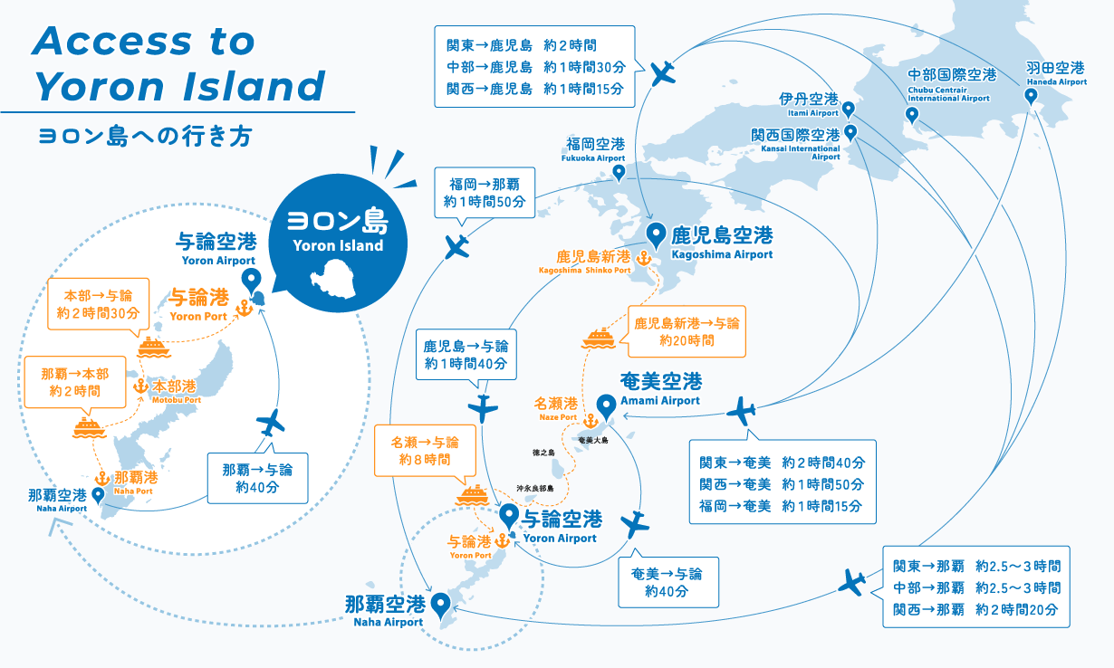 요론섬은 오키나와와 매우 가까워 오키나와 나하 공항에서 비행기로 이동하는 것이 가고시마현에서 오는 것보다 훨씬 빠릅니다. 이 섬은 행정적으로는 가고시마현에 속하지만, 오키나와와의 거리는 겨우 22km에 불과해 오키나와에서 배로 이동하기에도 매우 편리합니다.