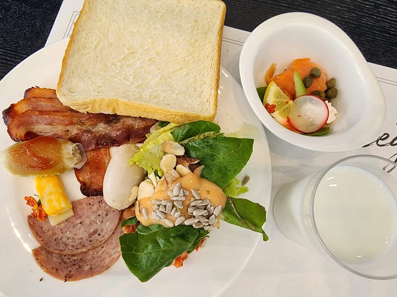 조식 메뉴에는 황태해장국, 사골우거짓국, 미역국 등 전통적인 한국의 국물 요리가 포함되어 있어, 아침에 몸을 따뜻하게 해주는 건강한 식사를 즐길 수 있습니다. 샐러드바에서는 신선한 채소와 다양한 재료를 이용하여 건강하고 맛있는 식사를 준비할 수 있습니다. 하지만 계란 프라이나 오믈렛은 제공되지 않으니 이 점을 참고하시기 바랍니다.
