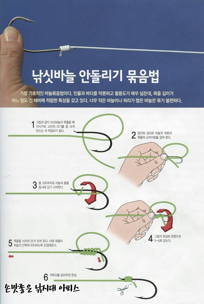 - 묶는 방법: 낚싯바늘의 눈에 라인을 통과시킨 후, 작은 고리를 만들고 바늘구멍 쪽으로 5~6회 감아 매듭을 완성합니다.