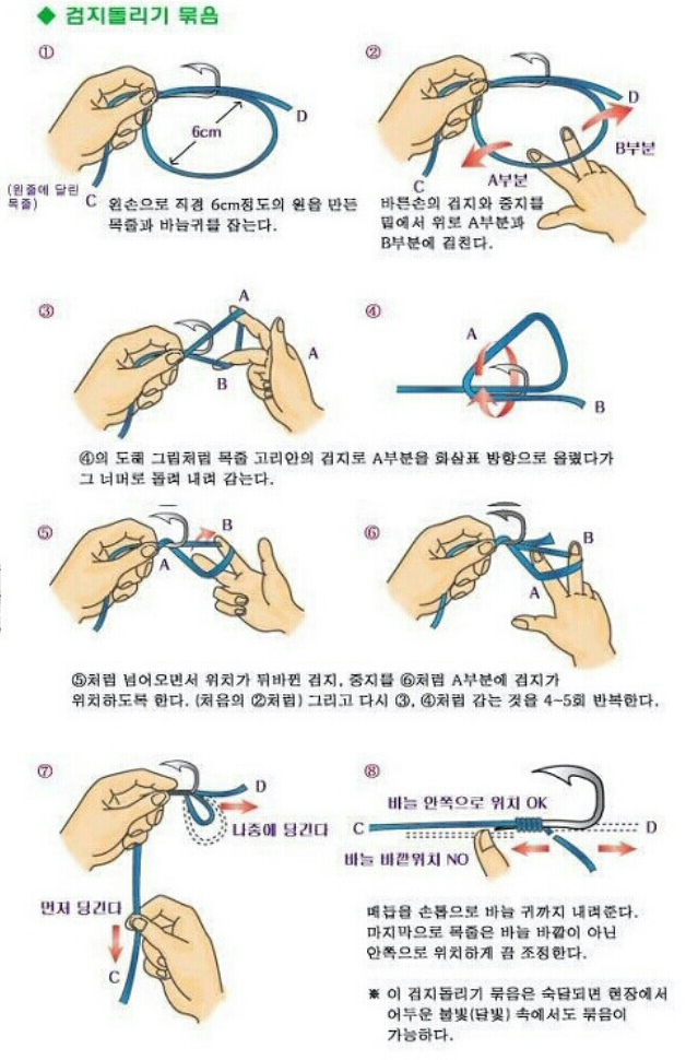 검지돌리기 매듭은 낚싯바늘 묶는 방법 중 가장 빠르게 익힐 수 있으면서도 강력한 매듭법입니다.낚시바늘 묶는 방법 5가지 및 봉돌 도래 낚싯줄 묶는 방법