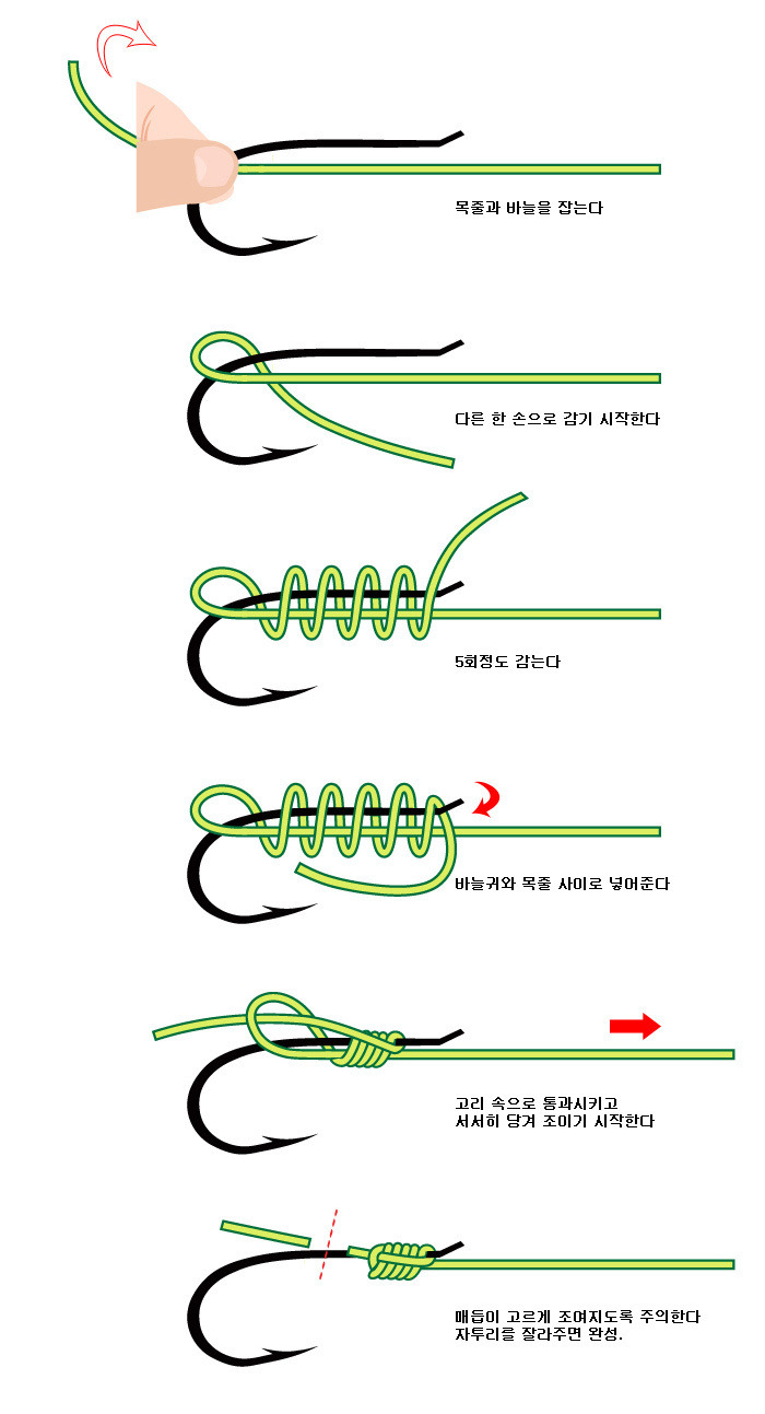 - 주의사항: 목줄이 바늘의 안쪽으로 위치하도록 조정하여, 매듭이 풀리지 않도록 강하게 당겨 마무리해야 합니다.