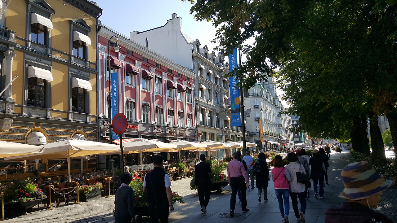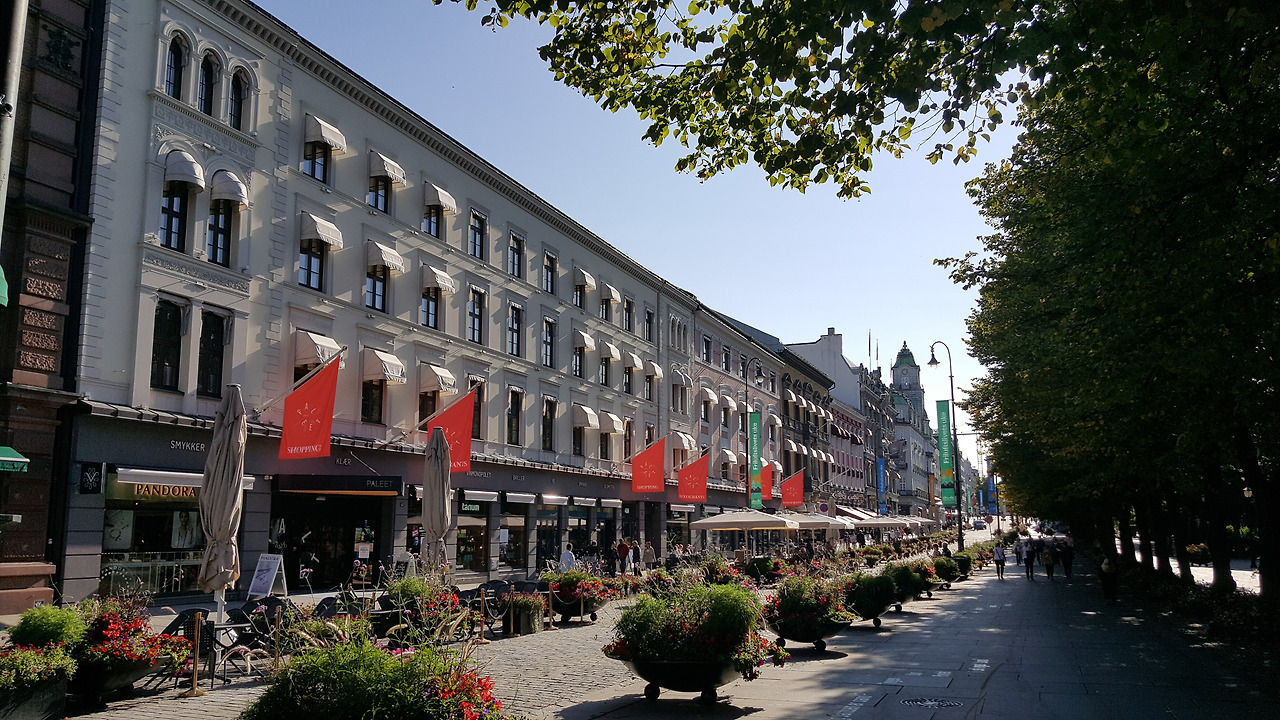 여름철에는 거리 곳곳에 액세서리와 선물을 파는 노점이 생기며, 공원에서는 현지인과 관광객들이 어울려 일광욕을 즐깁니다. 거리 중심에는 국회의사당과 현대적인 레스토랑이 자리하고 있으며, 국립극장 근처에서는 유명 작가 헨리크 입센과 비에른손의 동상을 볼 수 있습니다.