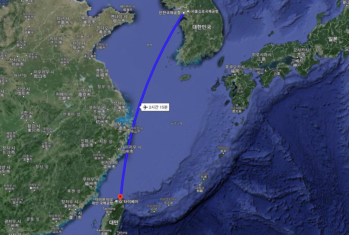 - 김포-타이베이(송산공항): 약 2시간 20분~2시간 40분