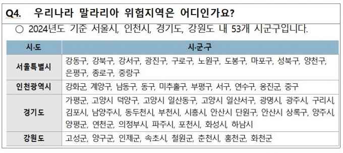 2024년 현재, 대한민국에서 말라리아 위험 지역으로 지정된 곳은 서울특별시, 인천광역시, 경기도, 강원도의 총 53개 시군구입니다. 다음은 각 지역의 상세 목록입니다: