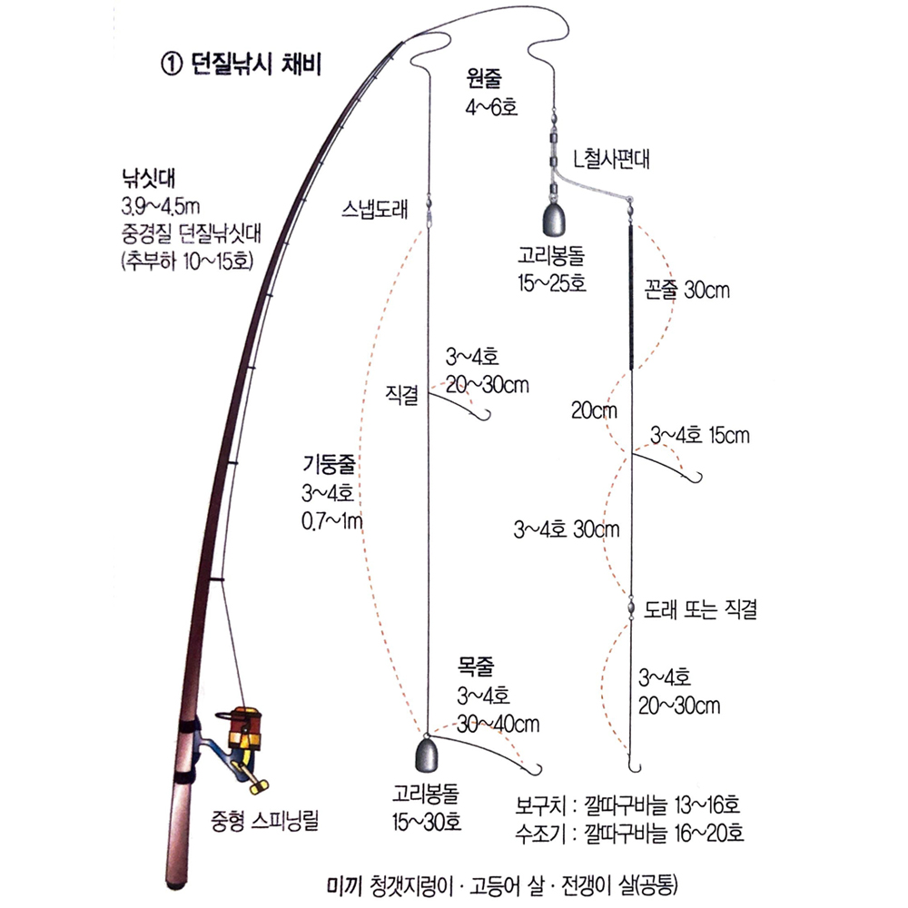 - 봉돌: 30호에서 50호 봉돌을 사용하여 채비를 바닥에 깔아 두는 것이 좋습니다.