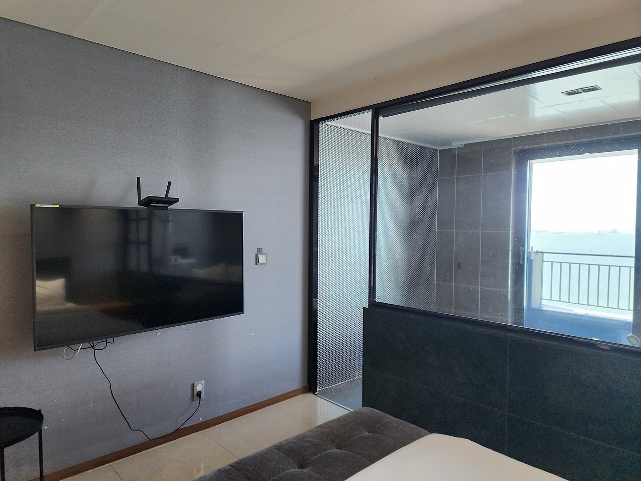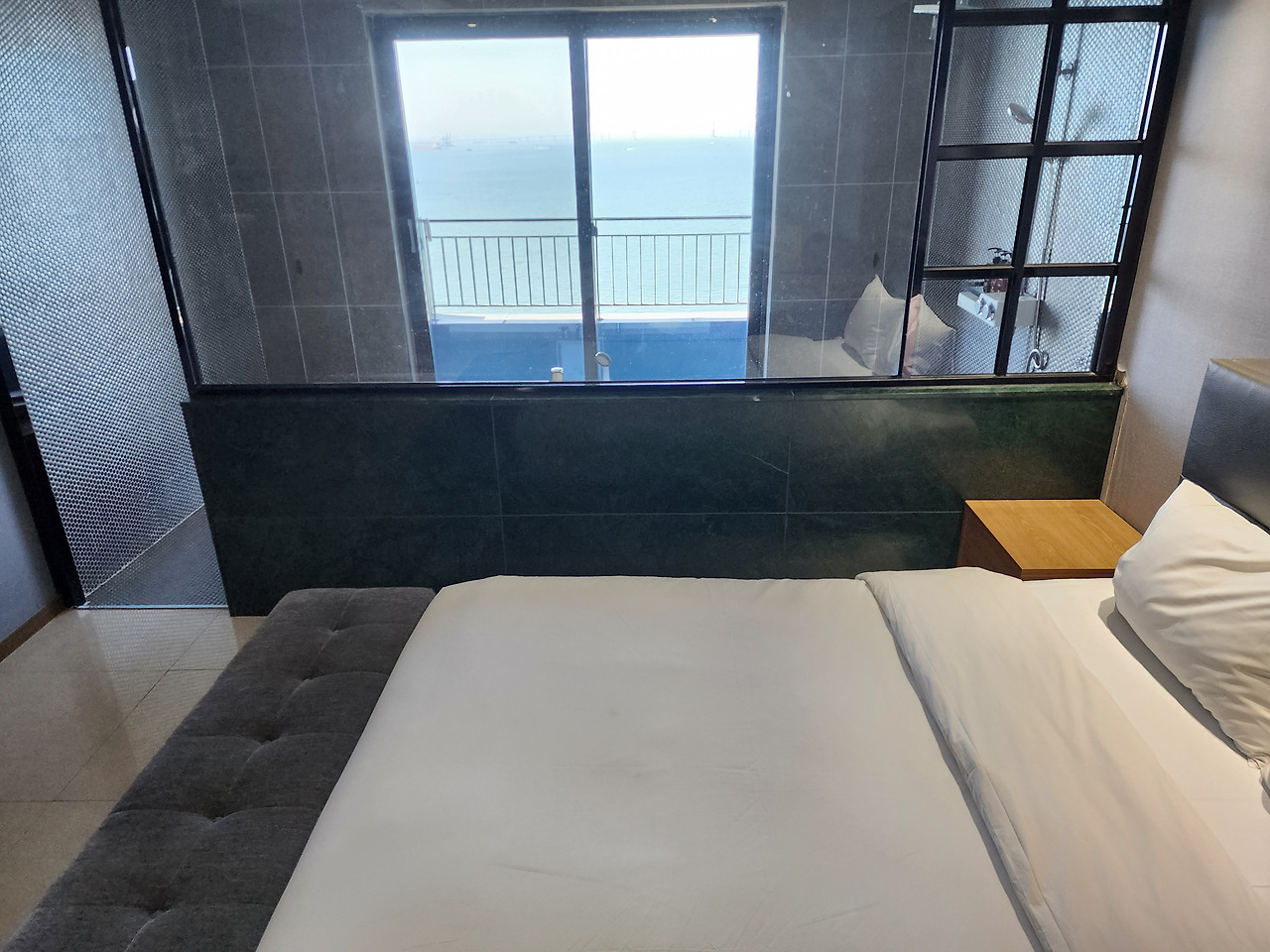 욕조 전면은 시야가 트인 대형 창이지만 바닥 높이가 높아 누워서는 수면이 보이지 않습니다. 170㎝ 성인 기준 무릎 꿇고 허리를 펴야 수평선이 겨우 들어오는 구조라 ‘욕조 속 오션뷰’ 콘셉트를 기대했다면 다소 실망할 수 있습니다. 창 하단이 모루(불투명) 처리되지 않았기에 일어서면 전망은 탁월하지만 프라이버시를 스스로 조절해야 합니다.