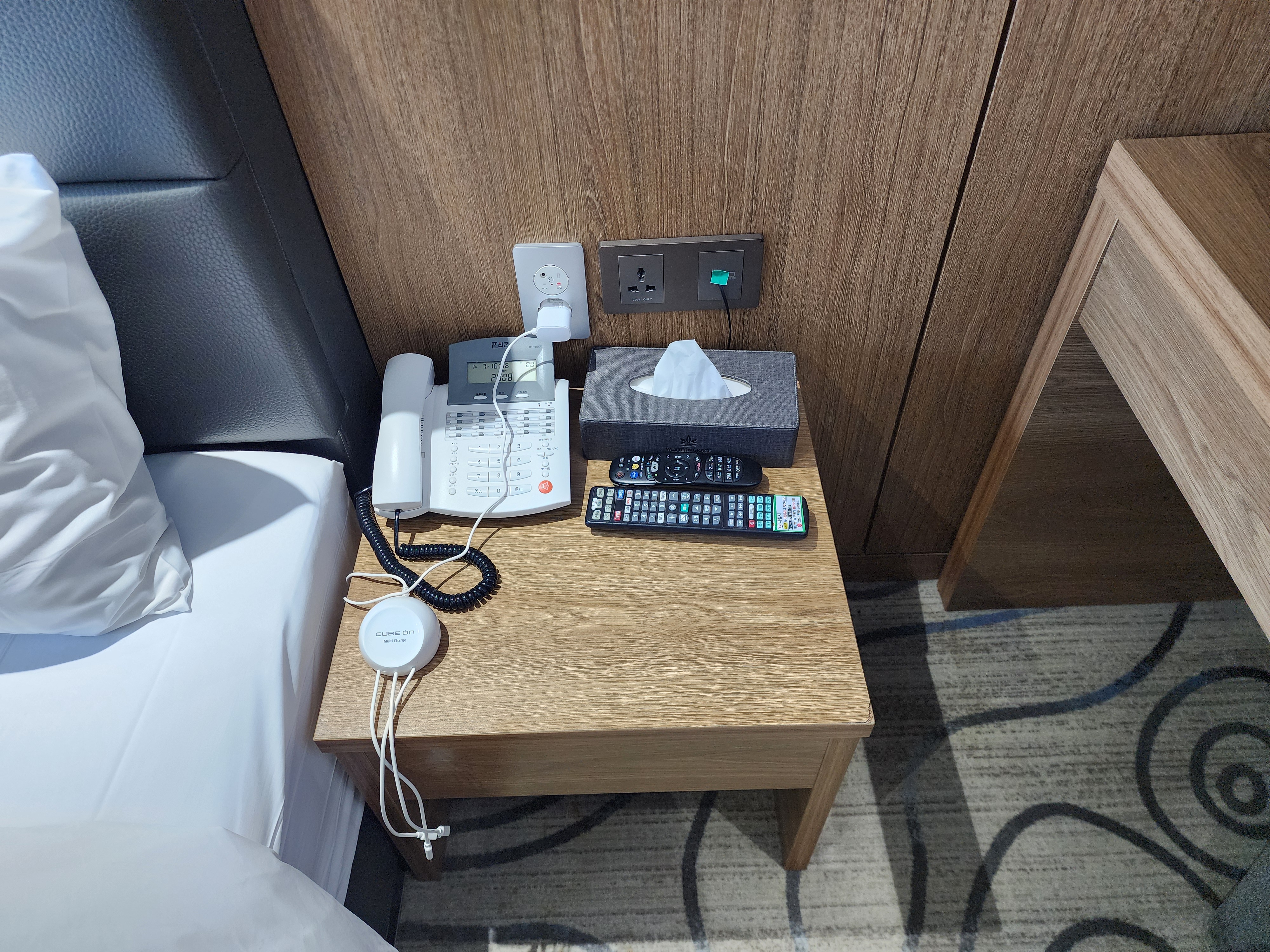 - 벽면 콘센트 220V 2구·USB 타입A 1구, 침대 좌우 사이드에도 각각 1구씩 배치