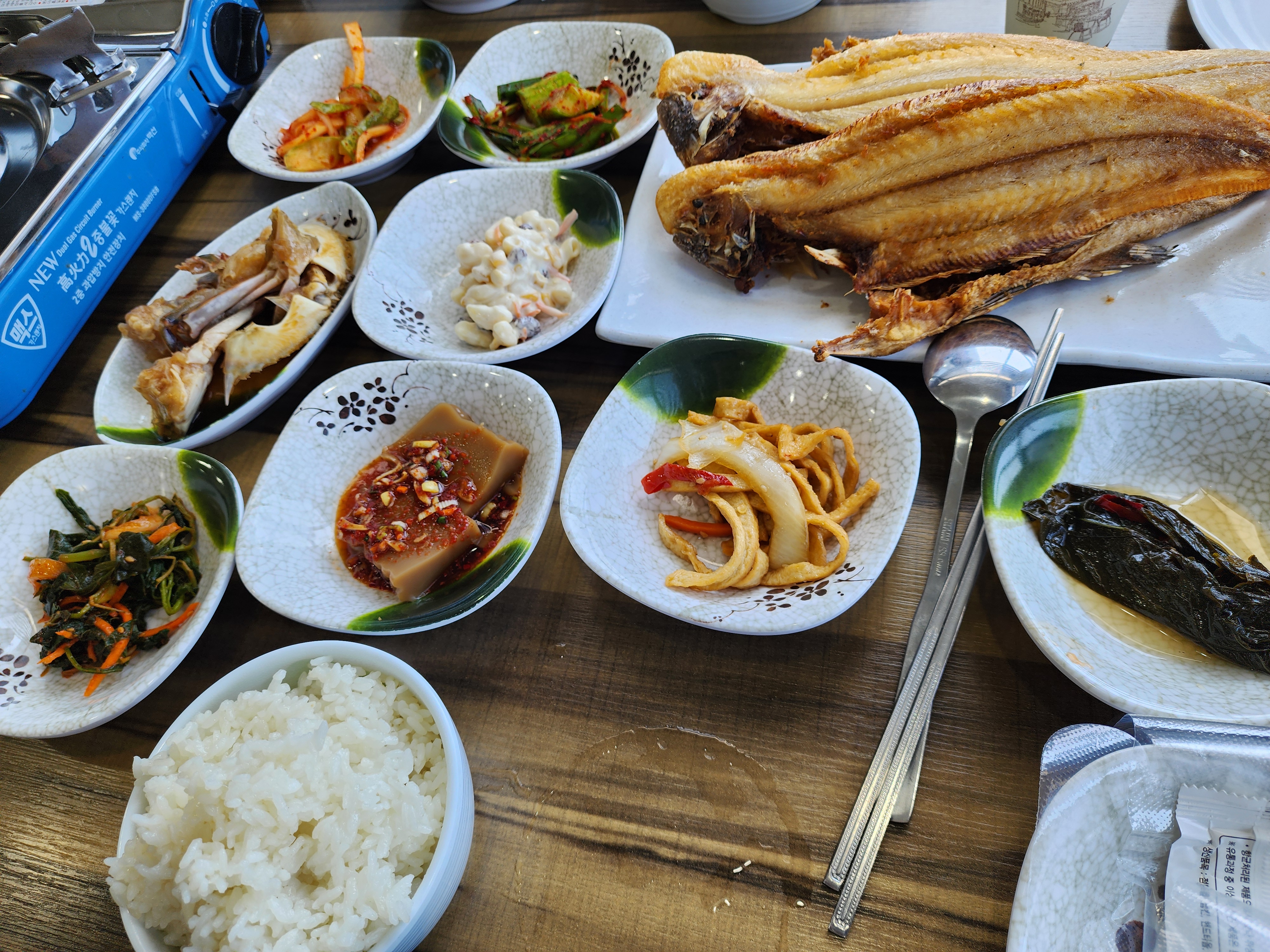 창가 자리에 앉아 통창 밖으로 보이는 마시안 해변의 풍경을 즐기며 식사를 시작했습니다. 기본 밑반찬이 먼저 나왔는데, 묵은지 김치, 간장게장, 된장국, 도토리묵, 콩나물무침, 고추장아찌, 오뎅볶음 등 다양했습니다.