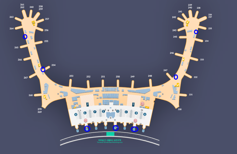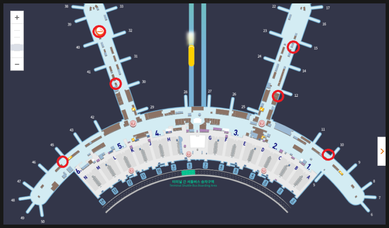 - 10번, 12번, 15번, 30번, 40번, 45번 게이트 부근