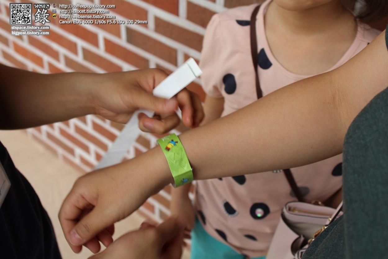 입장권을 끊으면 이렇게 종이 띠를 팔에 채워줘요.