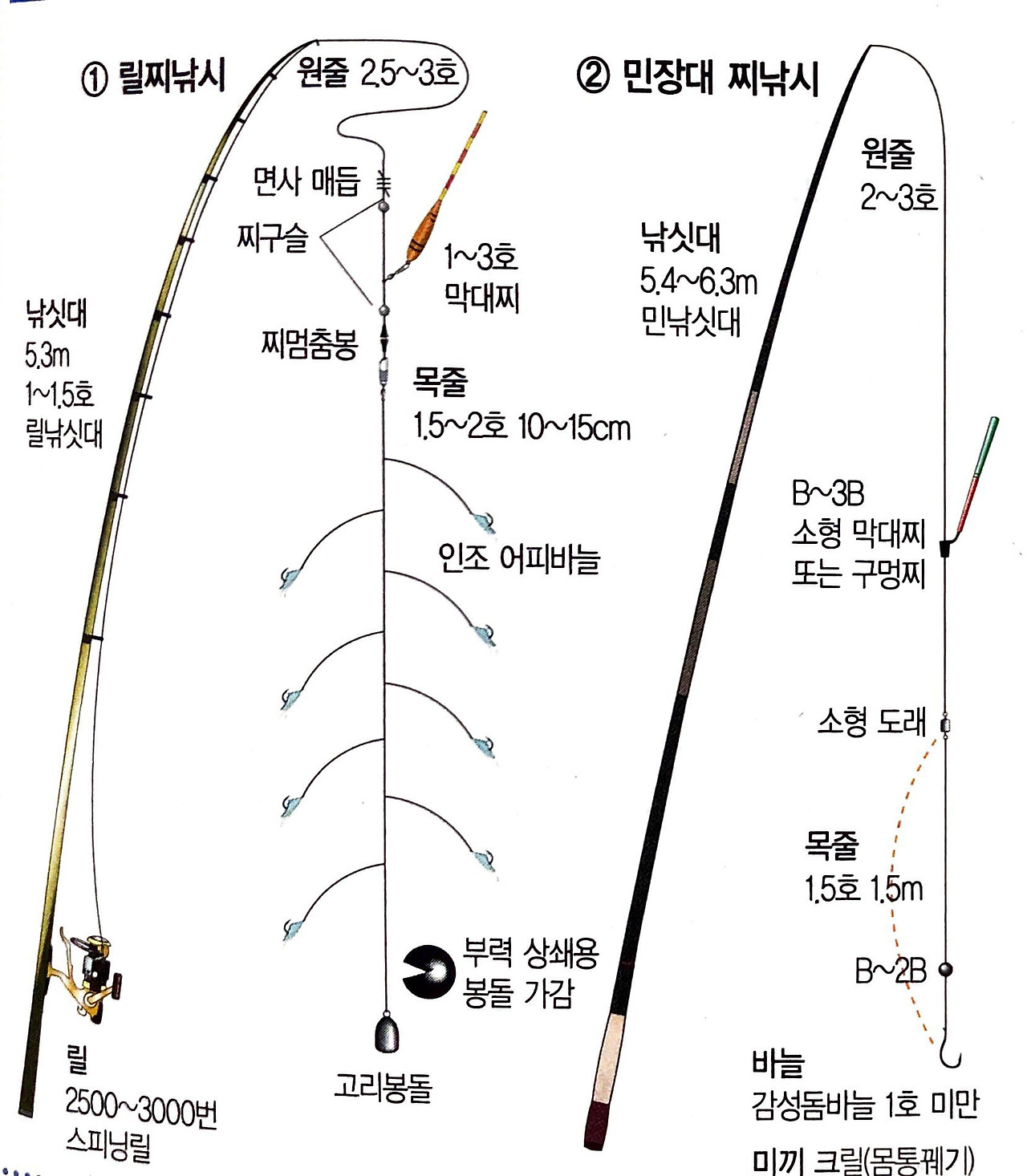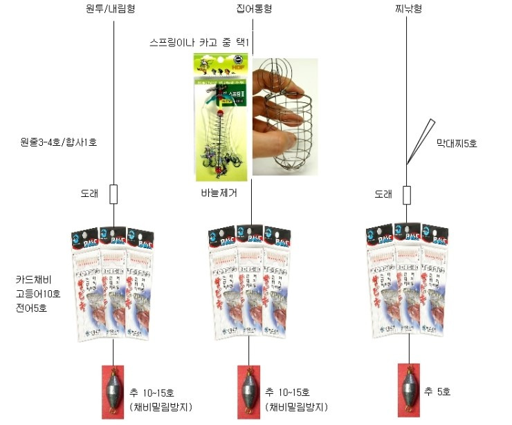 채비를 할 때는 찌의 선택이 중요한데, 보통 3~5호 막대찌를 사용합니다. 현지에서는 막대찌 중앙에 둥근 스치로폼을 끼워 복원력을 높인 일명 ‘오뚜기찌’를 사용하는데, 이 찌는 어신을 분명하게 전달하고 밑채비가 엉키지 않는 장점이 있습니다.