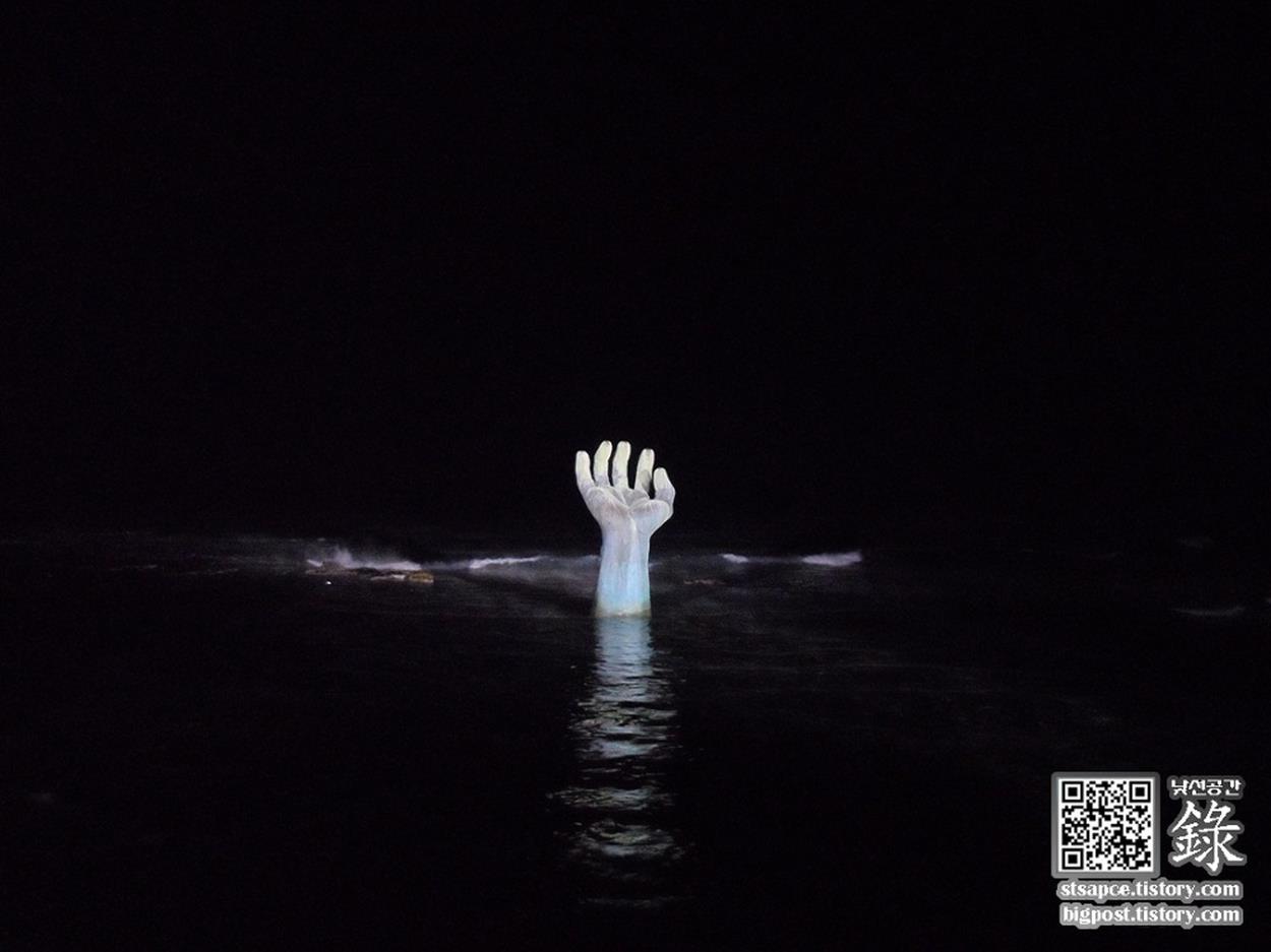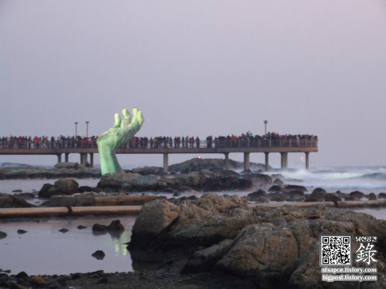 아래 사진은 해맞이 광장이 끝난 지점의 앞바다에 왼손을 마주 보고 솟아 있는 오른쪽 상생의 손의 모습이에요.