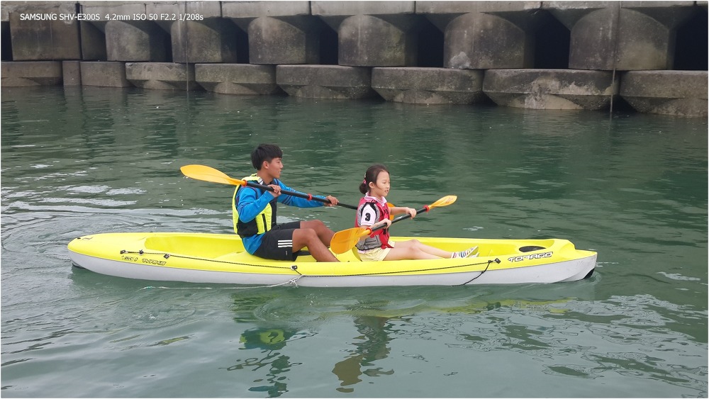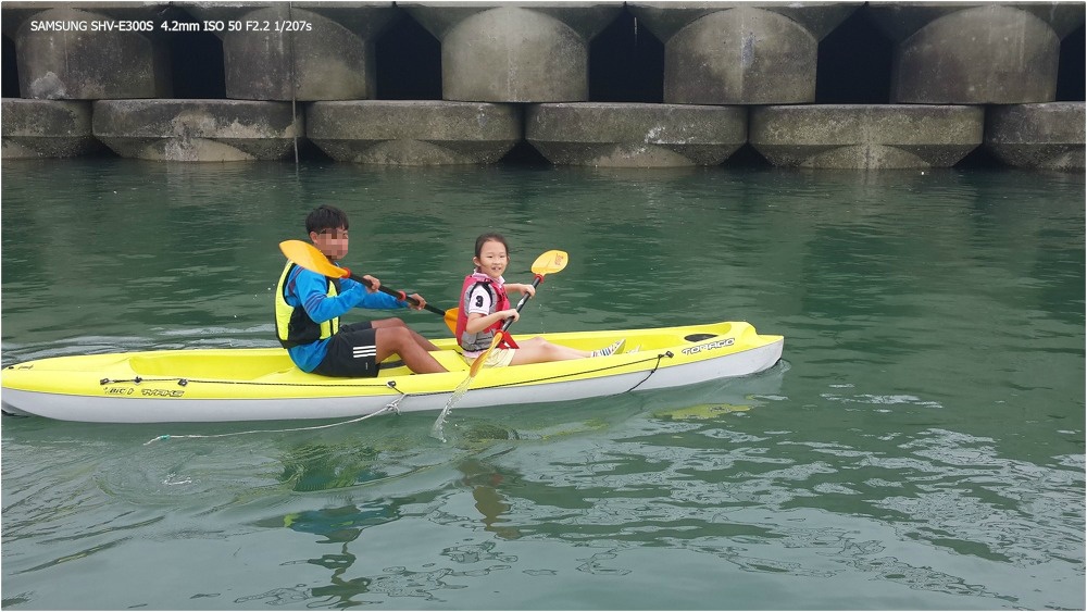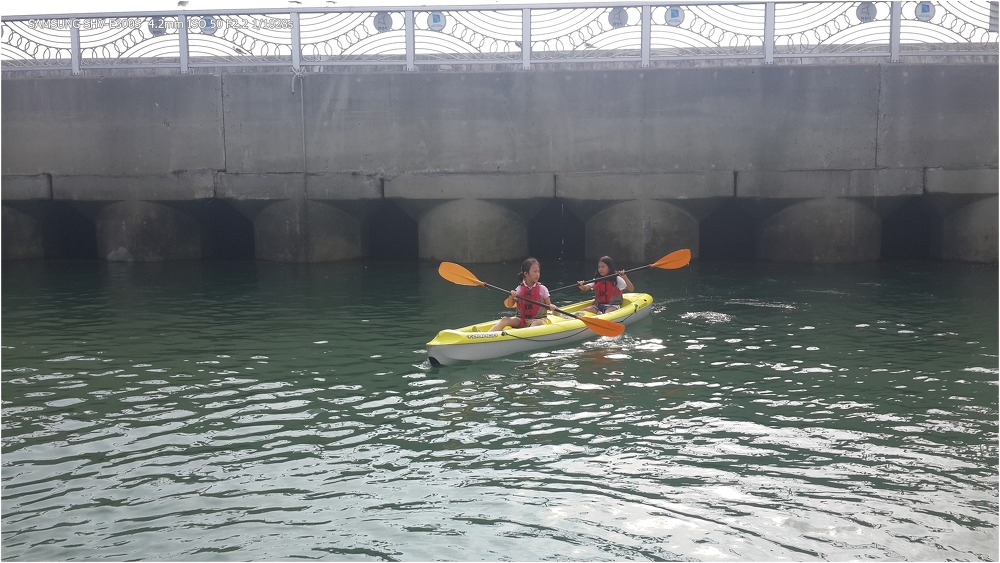 딸아이와 뒤에 딴 사람은 안전요원이다. 1:1 탑승으로 카약 체험 교육을 시행하는데도 비용은 무료!