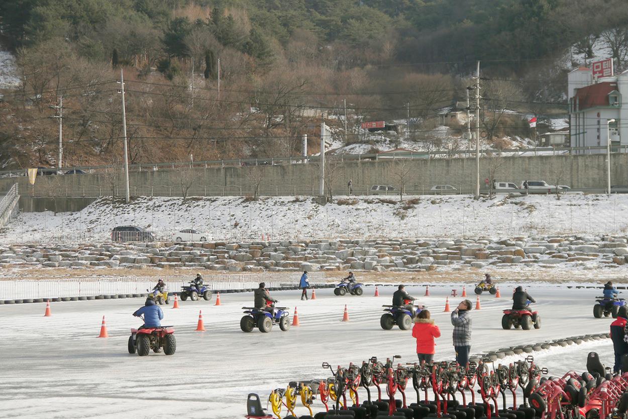 여느 겨울 송어축제장들처럼 홍천강 꽁꽁 축제도, 눈썰매, 4륜 바이크, 얼음썰매 등의 놀이시설이 갖추어지고요.