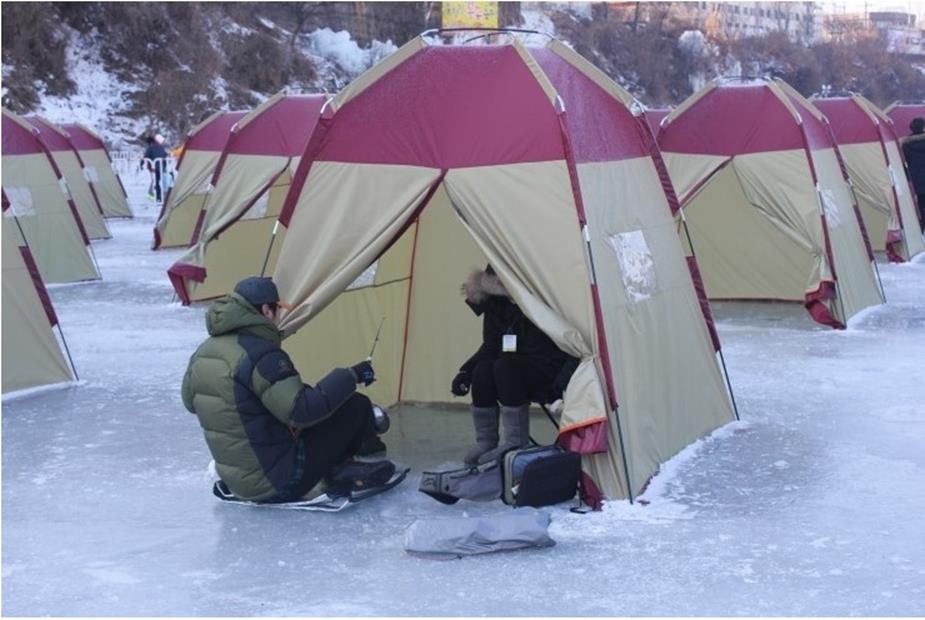 자유 낚시보다 텐트 송어낚시가 비싸긴 하지만, 얼음판 위에서 낚시할 때 텐트가 있고 없고 가 엄청난 차이를 가져와요. 텐트가 없으면 정말 추워요~